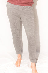 OUTSTANDING SOFT QUALITY, BRUSHED FRENCH TERRY SWEATPANT , COLOR HEATHER GREY. RELAXED FIT THRU OUT LEG WITH SELF BAND AT LEG OPENING. SLASH POCKETS AT SIDES. RIRI ZIPPER BACK WELT POCKET. PULL ON WAISTBAND.