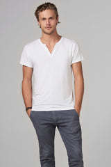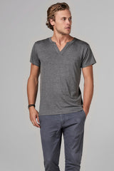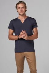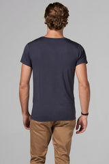 Super soft, no sheen, siro micro modal quality. Cross V-neck tee,slim fit body, w/ double needle stitch hem and sleeve.