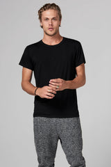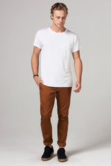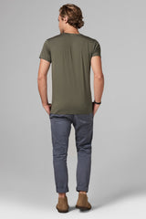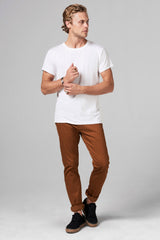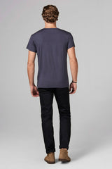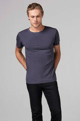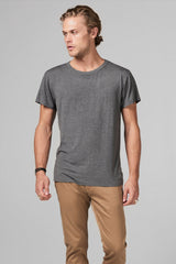 Crew neck , slim fit body, self neckband, regular fold up hemming w/ double needle stitch at hem and sleeve.
