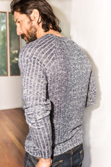 A light, breathable sweater perfect for fall days and evening warmth. A seasonless and versatile sweater with a self cuff and neckband. The wide rib material with a navy and white mix add a subtle elegance to this wardrobe essential.