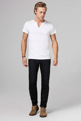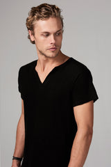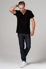 Thicker than your average 100% cotton fabric to wear into the colder nights. Cross V-neck tee,slim fit body, w/ double needle stitch hemmingat hem and sleeve.