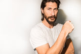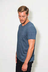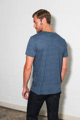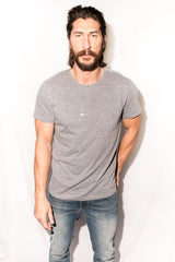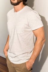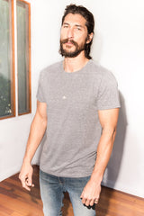 Relaxed fit, double raw edge detail at neckline, raw edge sleeve. Small curved pocket. Bourne fabrication jersey tee in heather grey. There's nothing like a great tee, it's a versatile garment you can wear on its own, or dress up with your favorite layer. Perfect as a base layer or alone.