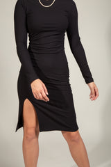The Catalina is slim fitting throughout. It provides shape while leaving plenty of room for comfort. Made with a heavy weight ribbed knit, this dress is endlessly wearable. The midi-length allows you the flexibility to dress up the look with heels or throw on some sneakers. The Catalina dress is complete with a high crew neck collar, long sleeves, and a side bottom slit. Date night has never been so easy.
