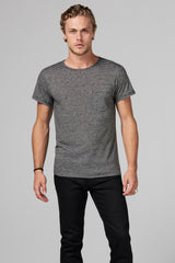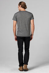 Thicker than your average 100% cotton fabric. Relaxed fit, double raw edge detail at neckline, raw edge sleeve. Small breast pocket. Thin black stripe in heather grey ground. There's nothing like a great tee, it's a versatile garment you can wear on its own, or dress up with your favorite layer. Perfect as a base layer or alone.