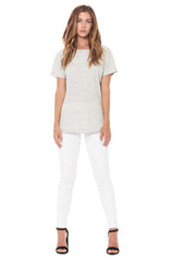 NOVELTY TEXTUREDCREW NECK TEE.WIDE NECK BAND. CLEAN FINISHED HEM AND SLEEVE IN TEXTURED NOVELTY CREAM THERMAL.