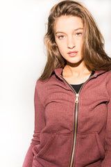 OUTSTANDING SOFT QUALITY, RELAXED FIT, ZIP FRONT , BRUSHED FRENCH TERRY HOODIE IN MAROON. FULL LENGTH EXPOSED RIRI QUALITY GOLD ZIPPER w/ ROUND CLASSIC RIRI PULL. FRONT KANGAROO FRONT POCKETS. TURN BACK SELF CUFF AND BOTTOM HEM.